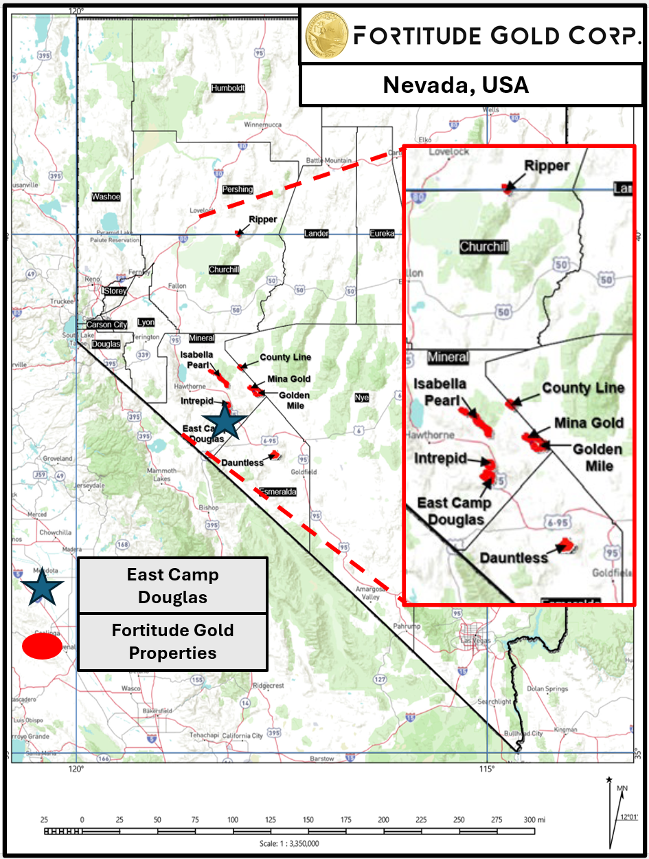 East Camp Douglas property is in the Silver Star mining district in Mineral County, Nevada, located approximately 6 mi (10 km) southwest of the town of Mina. The property covers 5,583 acres (2,259 ha) consisting of 293 unpatented lode mineral claims, 24 unpatented placer claims, 12 patented mining claims, and three fee land parcels. Low-sulfidation gold-bearing mineralization associated with a silica lithocap is observed in the southern portion of East Camp Douglas, while the northern portion of the East Camp Douglas area contains high-sulfidation style gold-bearing mineralization. Fortitude Gold exploration drill programs have intercepted high-grade gold mineralization in both the south and north portions of the property.