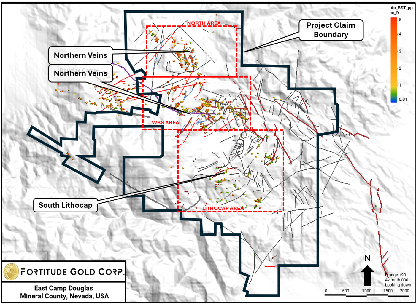 Mr. Reid continued, “While discovering a deposit and developing a mine are time intensive, we are fortunate to have a very mining supportive Federal Administration currently in place, gold prices regularly setting new all-time highs, and we are now positioned to thoroughly explore East Camp Douglas in short order. We were previously approached by major mining companies interested in partnering on the property. One such negotiation stalled as they wanted full operational control, a path to majority stake ownership, and an exploration program that was not targeted to utilize an exploration EA and the ability to explore up to 125 acres compared to an NOI’s 5-acre limited disturbance area. This spectacular JV Agreement enables us to maintain controlling interest, and if we are fortunate enough to discover one or more deposits, Fortitude Gold gets to advance those deposits into production. We are very excited that Hawthorne shares our vision of the potential in this unique district sized property, with its large gold mineralized lithocap to the south and high-grade gold veins to the north. East Camp Douglas’ potential for a major discovery warrants this substantial investment of 40 million dollars.”