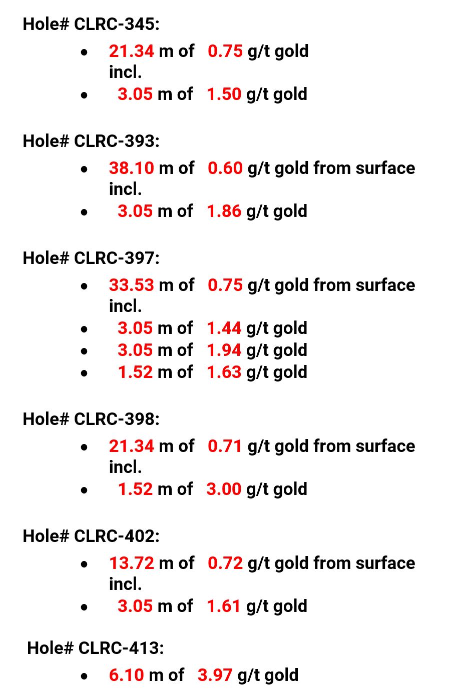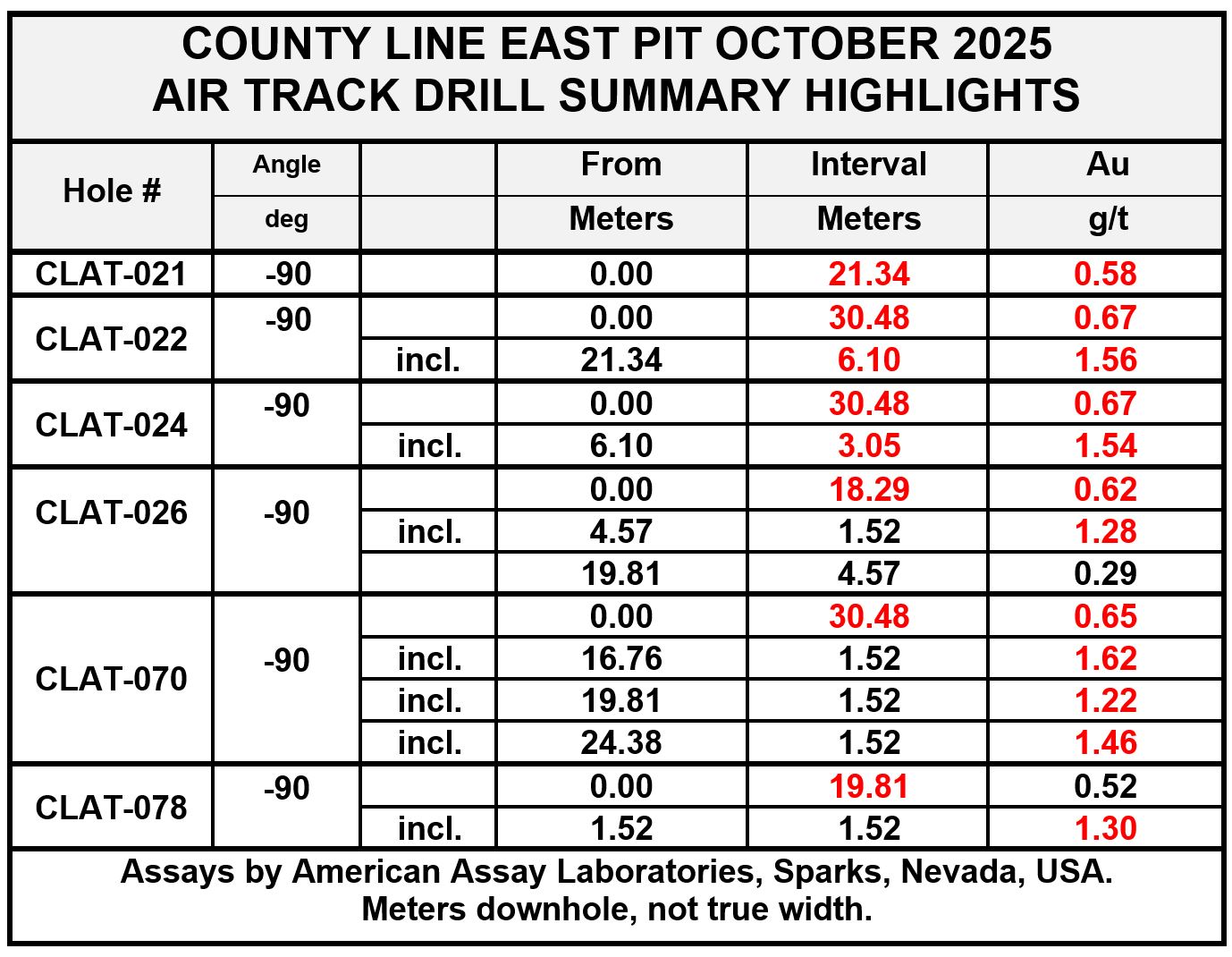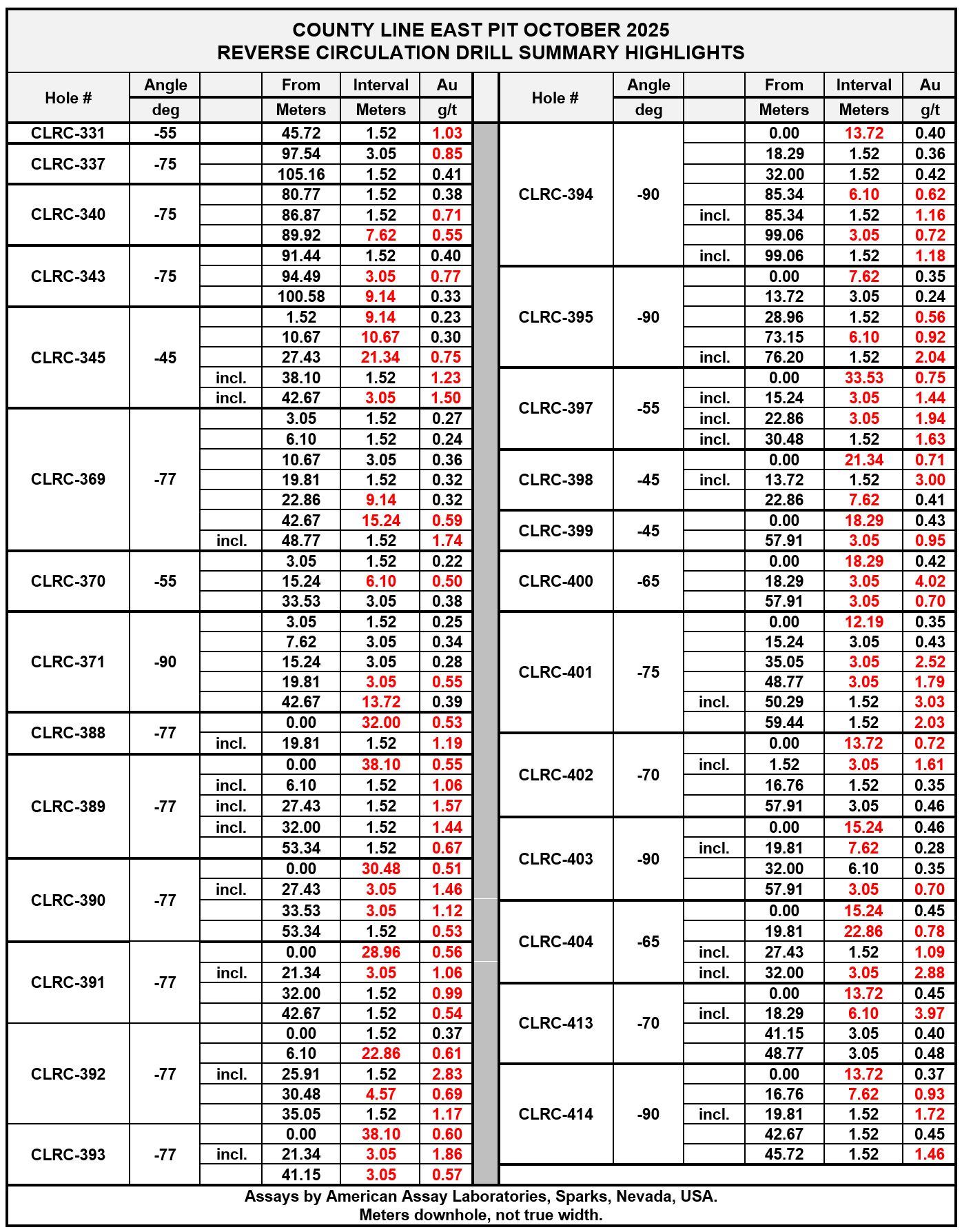 This drill program, completed months ago with results recently received after an assaying backlog, focused on the historic County Line East Pit and indicates a growing resource at the County Line property.  This program intercepted multiple intervals of oxide gold mineralization at and near surface.  The East Pit is located approximately 500 meters southeast of the main County Line historic open pit where the Company targets County Line gold production in mid-2026.  The Company recently received all approvals from the Bureau of Land Management (“BLM”) and the Nevada Division of Environmental Protection (“NDEP”) to construct and operate the County Line mine in September 2025.