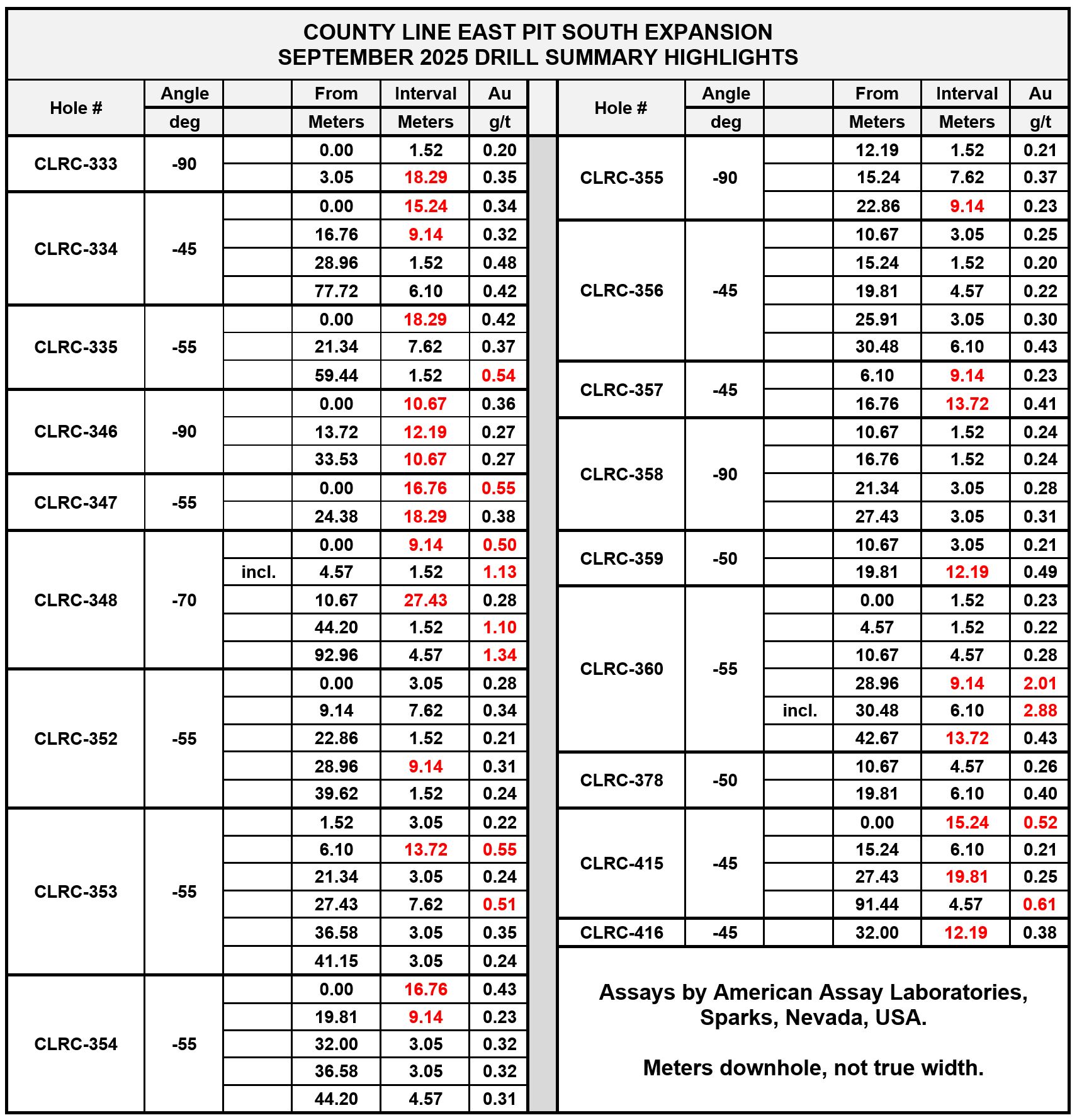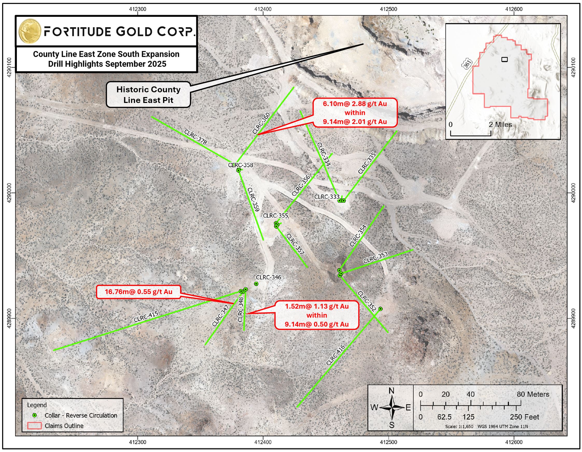 This step-out drill program, completed months ago with results recently received after an assaying backlog, focused on a previously untested area immediately south of the historic County Line East pit and indicates a potential growing resource at the County Line property. This program intercepted multiple intervals of oxide gold mineralization at and near surface. The East Pit is located approximately 500 meters southeast of the main County Line historic open pit. The Company targets County Line gold production in mid-2026 subject to the receipt of a pending State Reclamation Permit. Fortitude Gold successfully received its full Bureau of Land Management permit approval in September 2025.